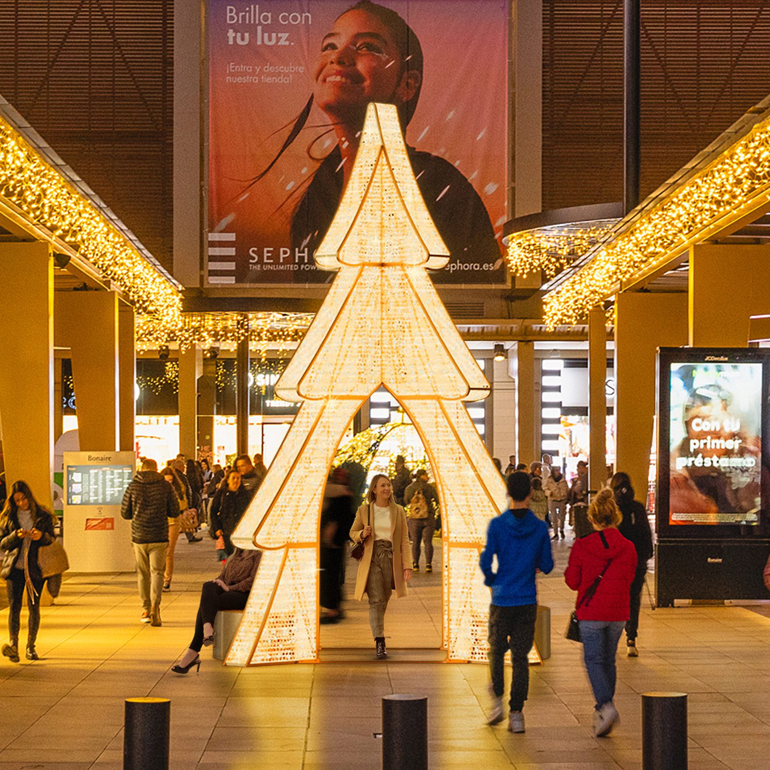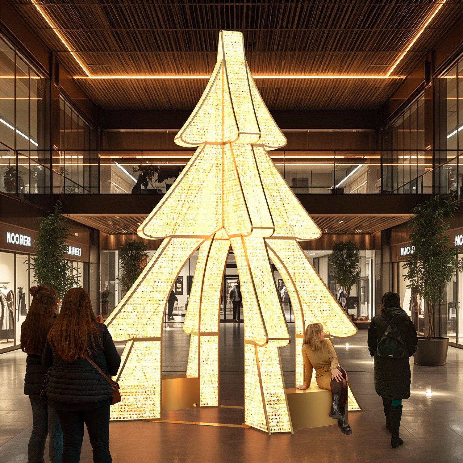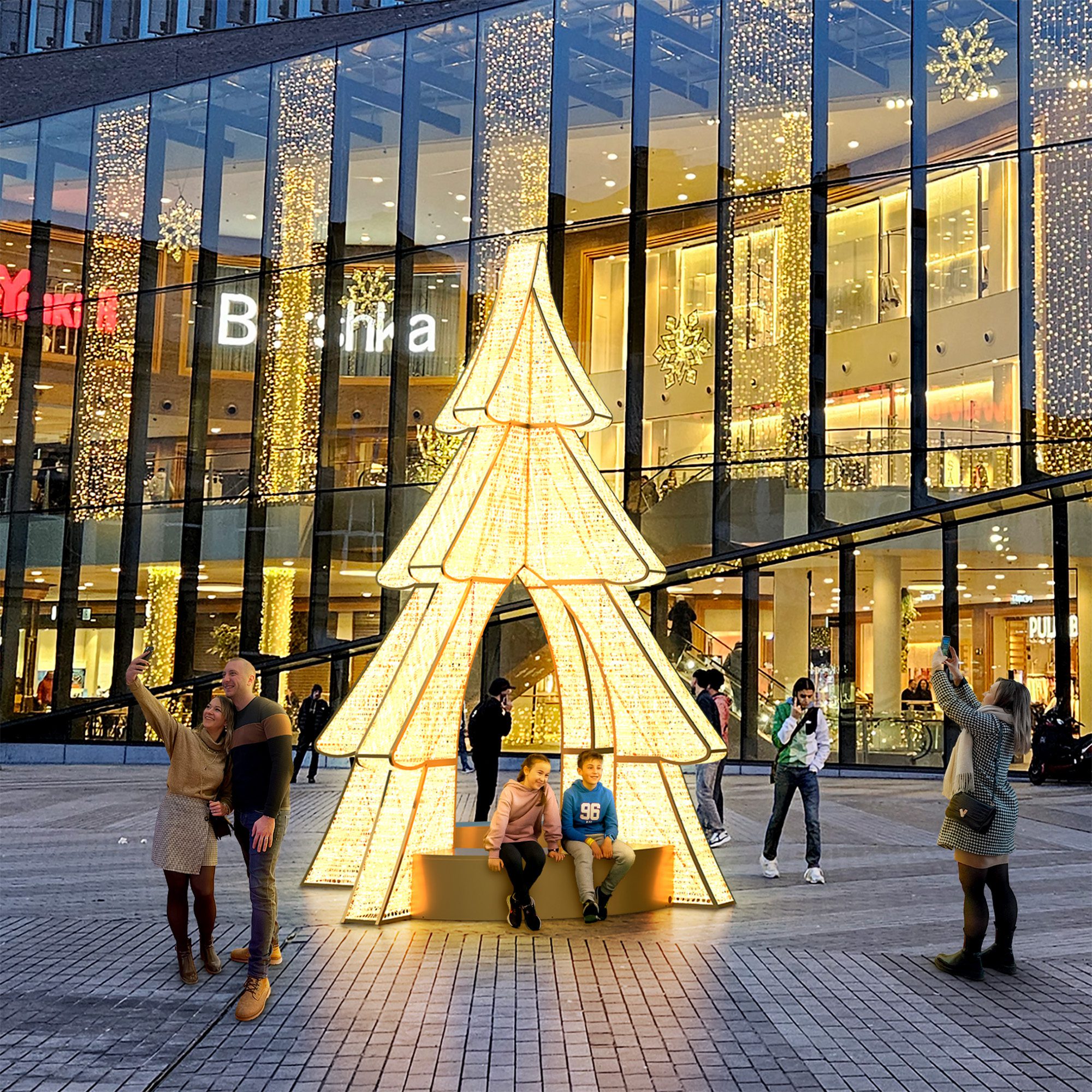 Der beleuchtete Riesentannenbaum Marostica verwandelt Ihre Räume in ein echtes Weihnachtserlebnis. Innen wie außen lädt er Besucher dazu ein, unter seinen funkelnden Zweigen zu flanieren und in eine zauberhafte Atmosphäre einzutauchen. Dank der integrierten Bänke wird er auch zu einem warmen und einladenden Ort zum Verweilen und für unvergessliche Fotomomente.